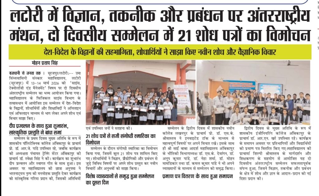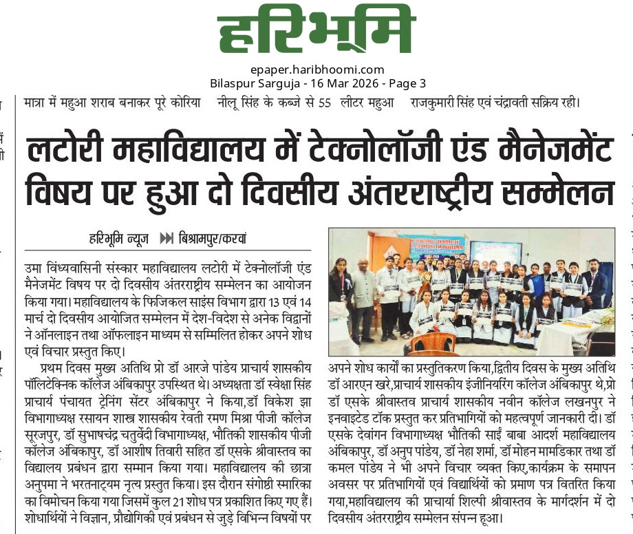 Tour – Trip International Conference Successful Organization of 2nd International Conference – ICSTM 13-14th March 2026 Uma Vindhyavasini Sanskar Mahavidyalaya, Latori राज्य स्तरीय खो – खो प्रतियोगिता सेक्टर स्तरीय खो – खो प्रतियोगिता Manali Tour Science Collage Topper Lab NSS Sports